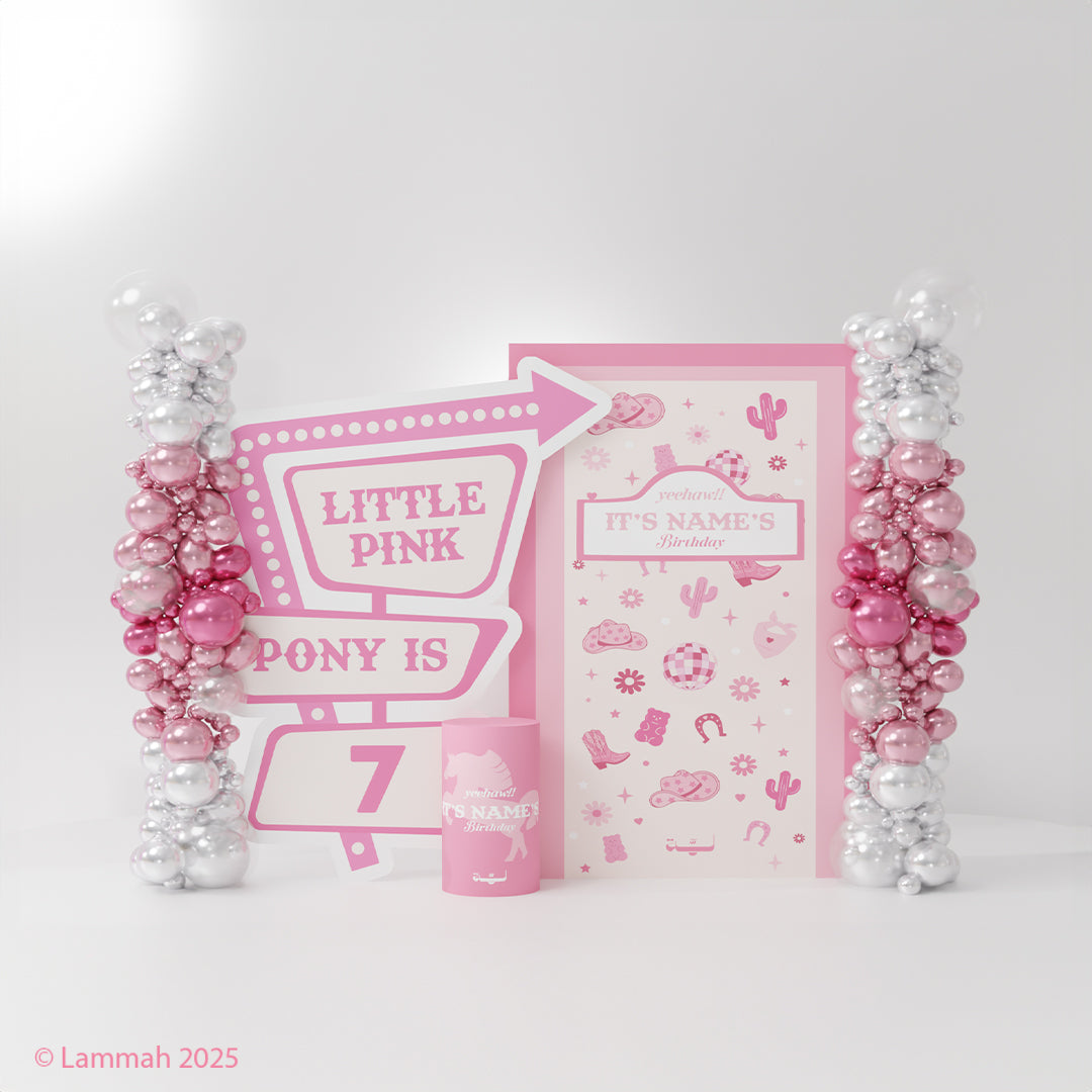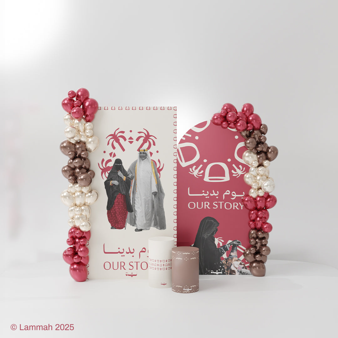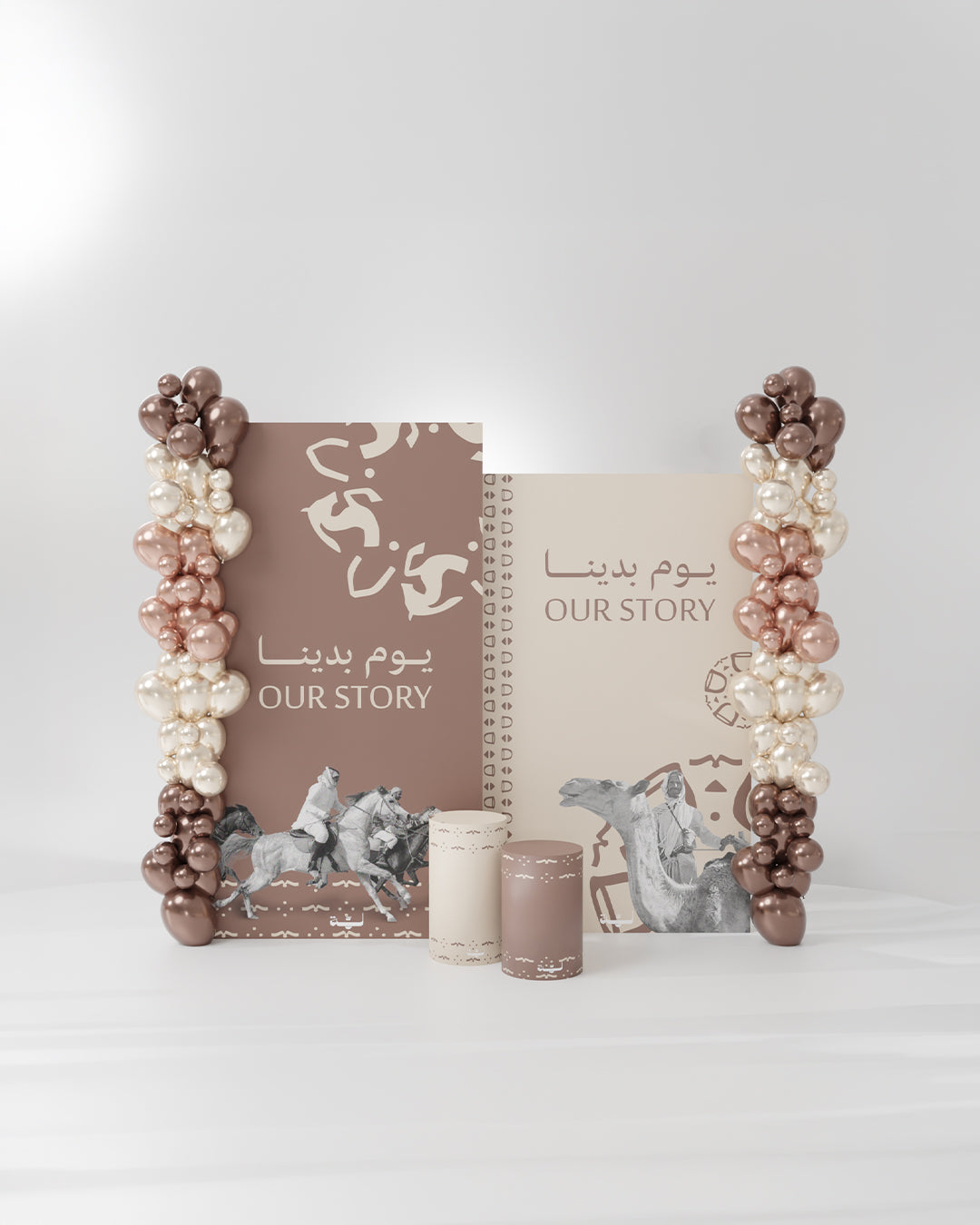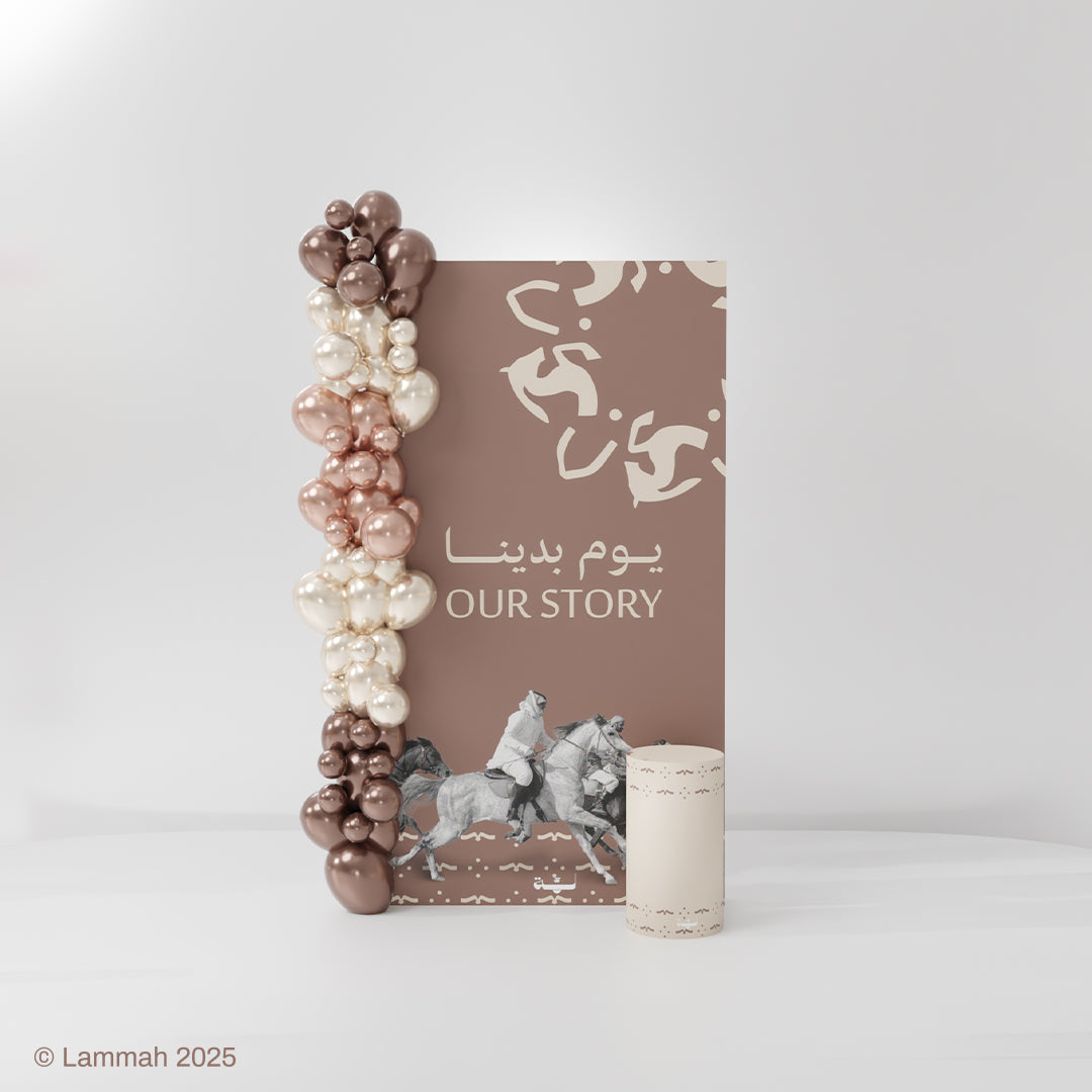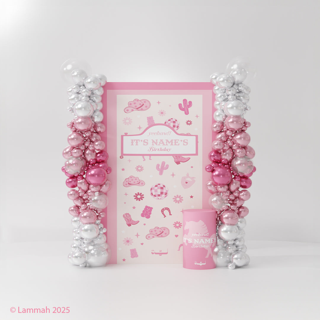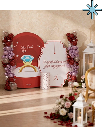تشمل الحفلة خلفية واحدة أو خلفيتين أو ثلاث خلفيات حسب المقاس المختار، بالإضافة إلى طاولة وعامودين بالونات.