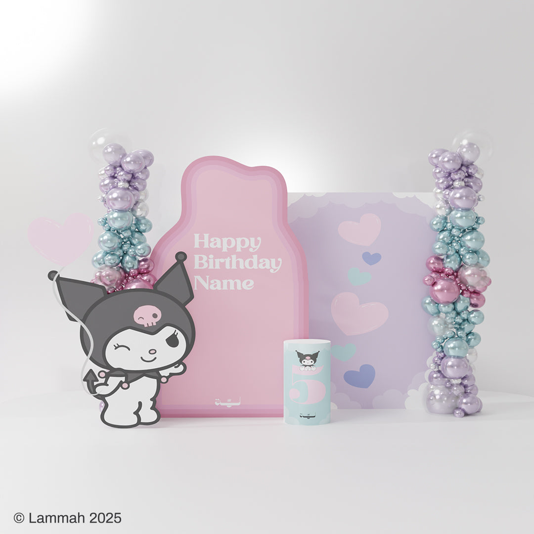 A cute Kuromi-themed birthday setup in soft pastel pinks, purples, and blues. Perfect for fans who want a playful and stylish celebration. Designed for kids’ parties, anime lovers, and themed birthdays.
